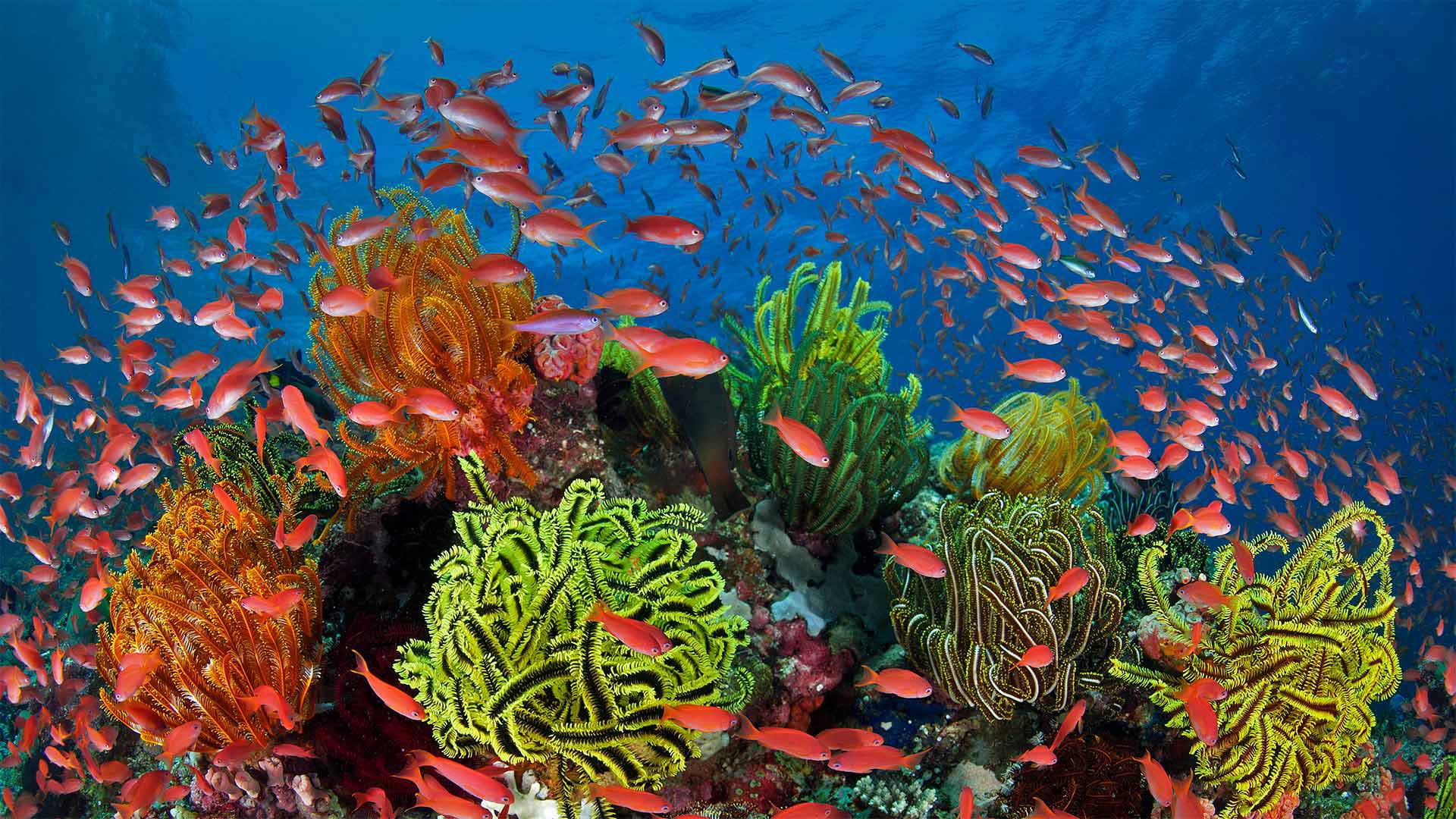 School of sea goldies with feather stars
