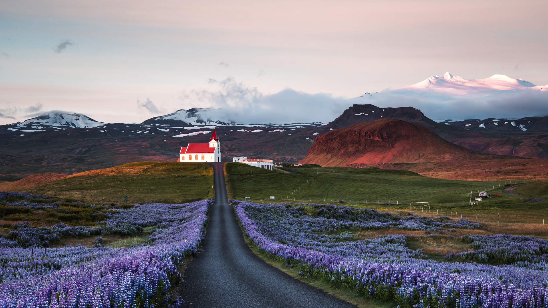 Lupine fields and church at sunrise, Snæfellsnes Peninsula, 冰岛 (© Matteo Colombo/盖蒂图片社)